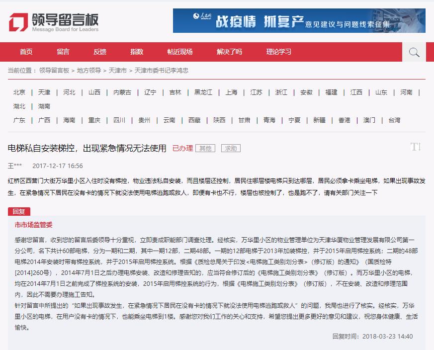 感謝您留言,收到您的留言后委領導十分重視,立即責成職能部門調查處理。經核實,萬華里小區的物業管理單位為天津華廈物業管理發展有限公司第一分公司,名下共計60部電梯,分為一期和二期,其中一期12部,二期48部。一期的12部電梯于2013年加裝梯控,并于2015年啟用梯控系統;二期的48部電梯2014年安裝時帶有梯控系統,并于2015年啟用梯控系統。根據《質檢總局關于印發<電梯施工類別劃分表>(修訂版)的通知》(國質檢特[2014]260號),2014年7月1日之后辦理電梯安裝、改造和修理告知的,應當符合修訂后的《電梯施工類別劃分表》(修訂版)。而萬華里小區的電梯,均在2014年7月1日之前完成了梯控系統的安裝,2015年啟用梯控系統的行為,根據《電梯施工類別劃分表》(修訂版),不在安裝、改造和修理范圍內,因此不需要辦理施工告知。